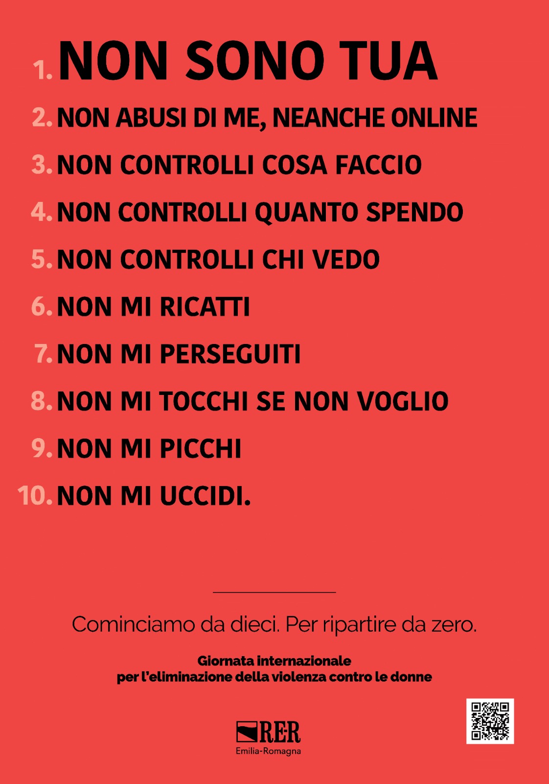 La Regione Emilia-Romagna ci ricorda, con la sua campagna multilingue, l’importanza di un messaggio chiaro e semplice: dieci NO, dieci divieti che devono diventare patrimonio collettivo. Il primo, il più essenziale, è quello da cui tutto parte: “Non sono tua”.Un’affermazione potente, che rivendica libertà, dignità, autodeterminazione.