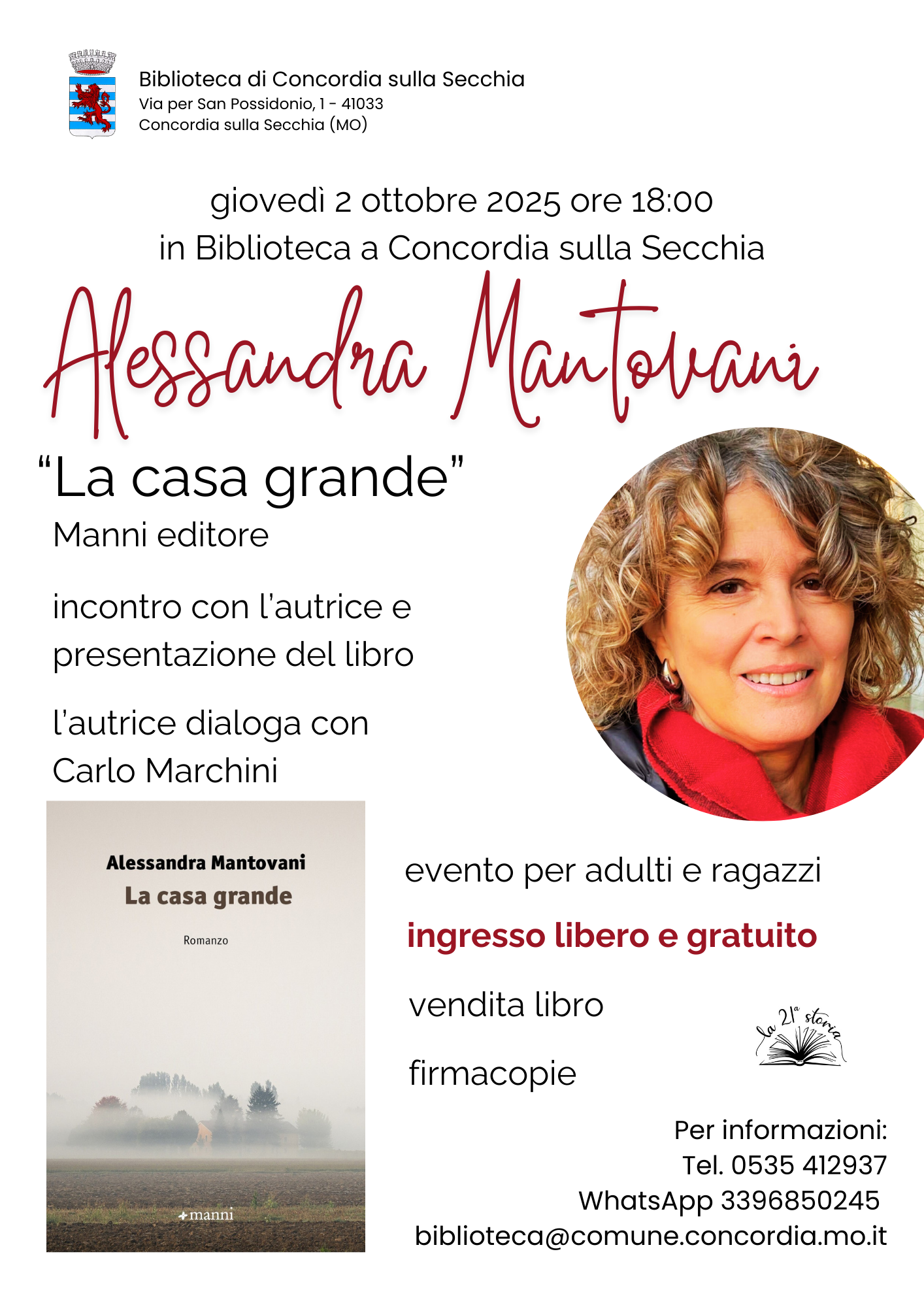 Giovedì 2 ottobre alle 18:00 sarà con noi Alessandra Mantovani autrice del libro "La casa grande" edito da Manni.