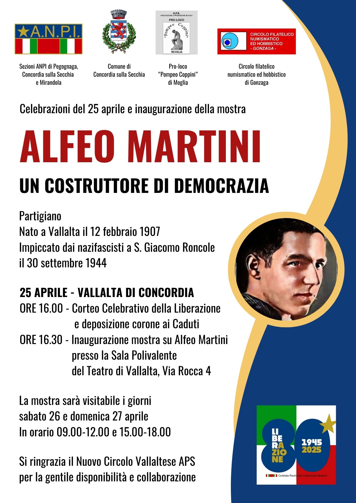 Alle ore 16:30 sarà inaugurata la mostra su Alfeo Martini, partigiano, vittima della violenza nazifascista, presso la Sala Polivalente del Teatro di Vallalta, Via Rocca 4.