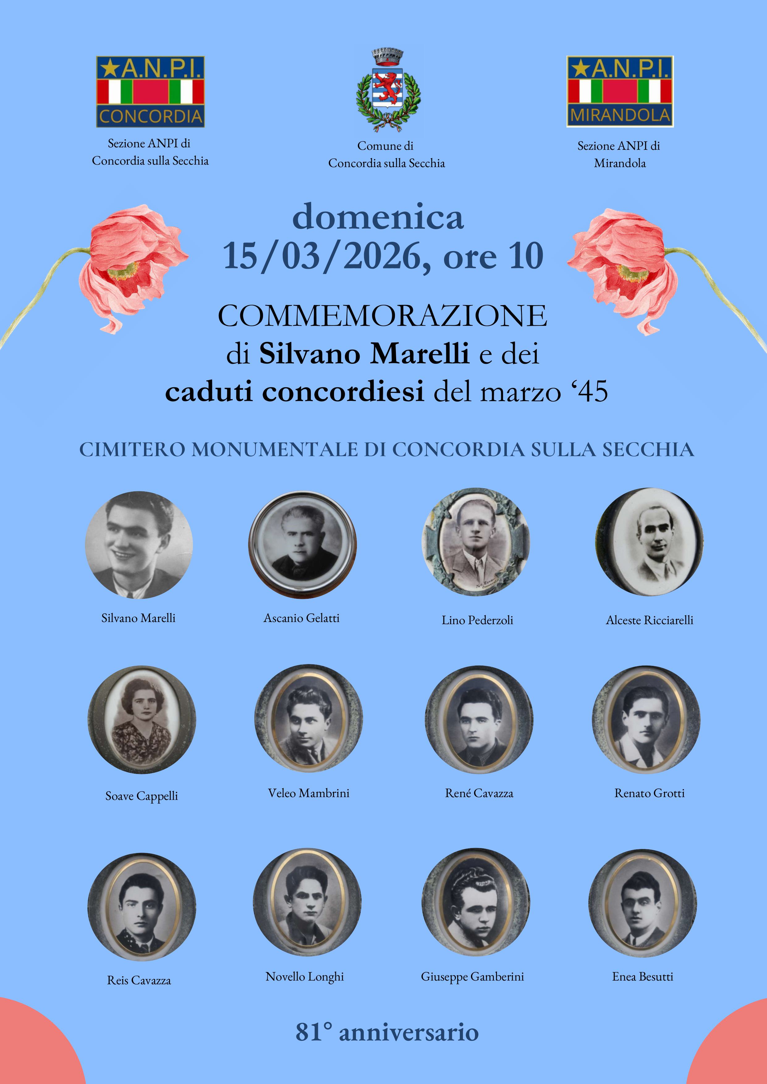Domenica 15 marzo, alle ore 10:00, presso il cimitero monumentale di Concordia, insieme ad ANPI Concordia e ANPI Mirandola, celebreremo l'81° anniversario del valoroso sacrificio del partigiano Silvano Marelli e dei caduti concordiesi del marzo 1945.