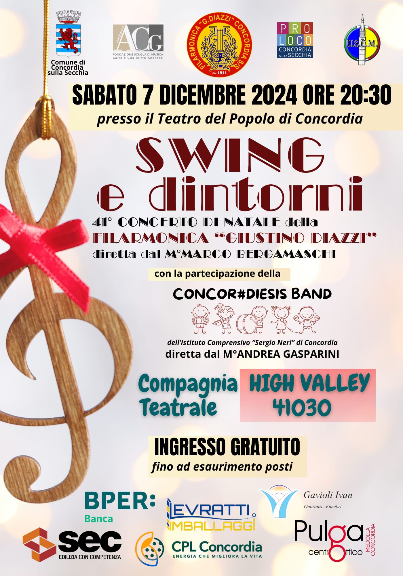 Sul palco saranno ospiti della Filarmonica, gli allievi della 𝐂𝐨𝐧𝐜𝐨𝐫#𝐝𝐢𝐞𝐬 𝐁𝐚𝐧𝐝, banda scolastica dell’Istituto comprensivo “Segio Neri” di Concordia diretta e coordinata dal M° Andrea Gasparini per un piccolo augurio natalizio a tutta la cittadinanza, e la 𝐜𝐨𝐦𝐩𝐚𝐠𝐧𝐢𝐚 𝐭𝐞𝐚𝐭𝐫𝐚𝐥𝐞 𝐇𝐢𝐠𝐡 𝐕𝐚𝐥𝐥𝐞𝐲 𝟒𝟏𝟎𝟑𝟎 del Circolo Culturale Vallaltese APS, che metterà in scena un noir anni 40 con la regia di Emanuele Consoli.