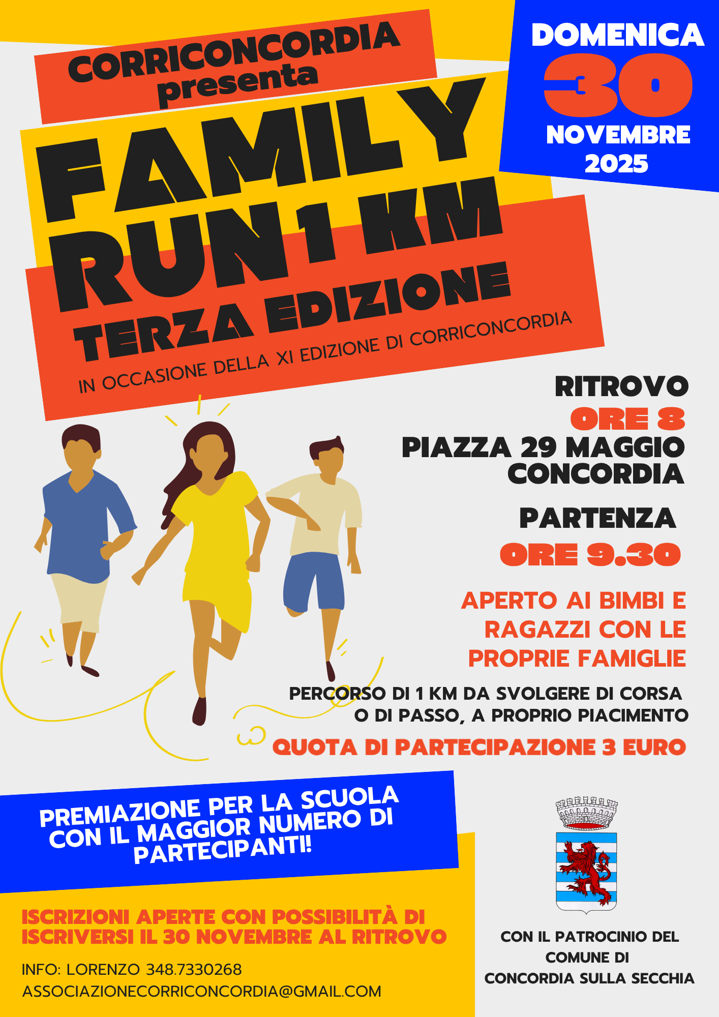 L'Associazione CorriConcordia, con il patrocinio e la collaborazione del Comune di Concordia e il contributo della Fondazione Cassa di Risparmio di Mirandola, organizza domenica 30 novembre 2025 l'undicesima edizione della “CorriConcordia“, la quarta edizione della Half Marathon, la terza edizione della "Family Run Km 2", il secondo Memorial Gennari Flora e la tredicesima prova Gran Prix Modenese