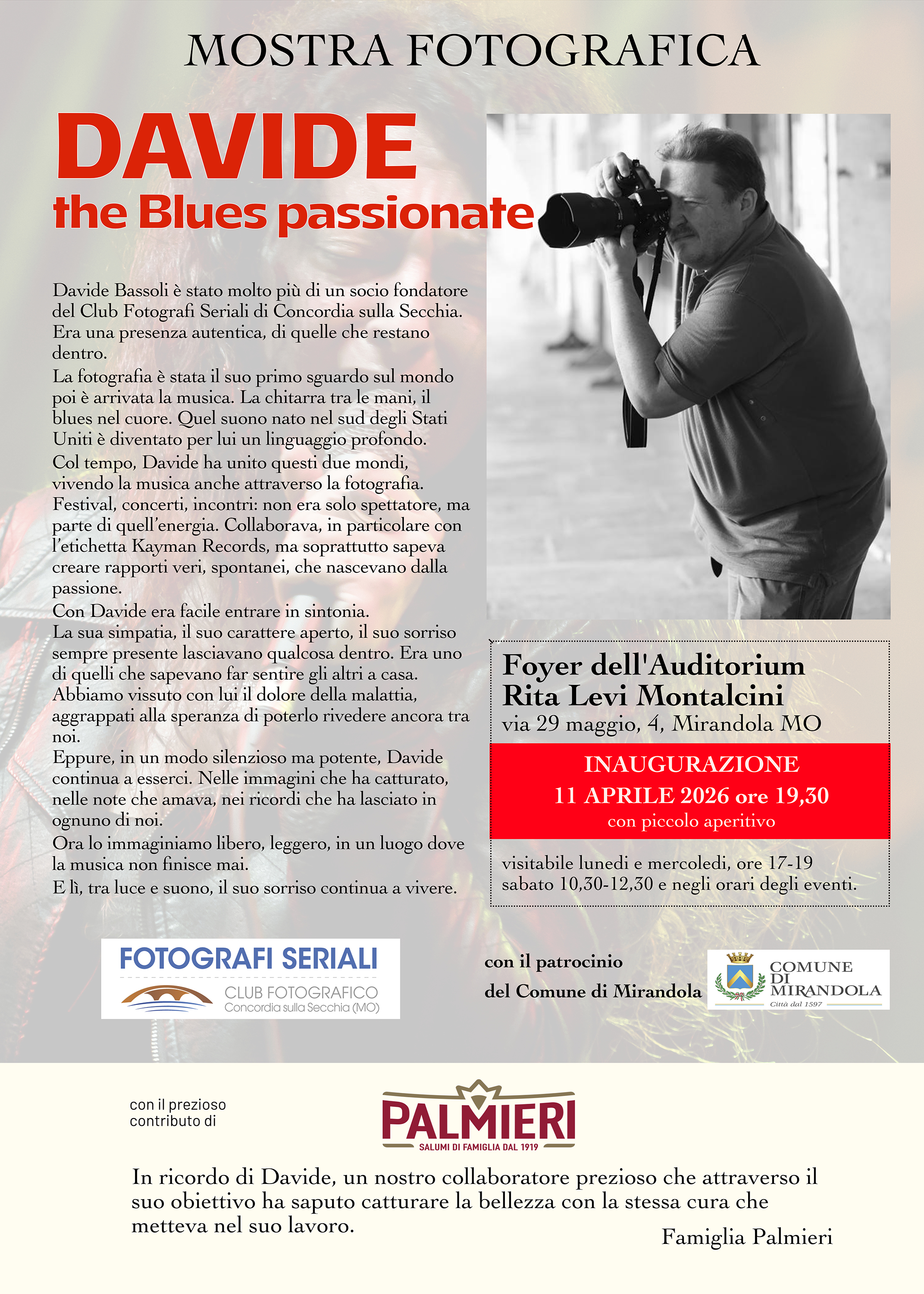 Sabato 11 aprile alle ore 19:30 sarà inaugurata, presso il foyer dell’Auditorium Rita Levi Montalcini di Mirandola, la mostra fotografica “Davide the Blues Passionate”, che espone una selezione di fotografie realizzate da Davide Bassoli.