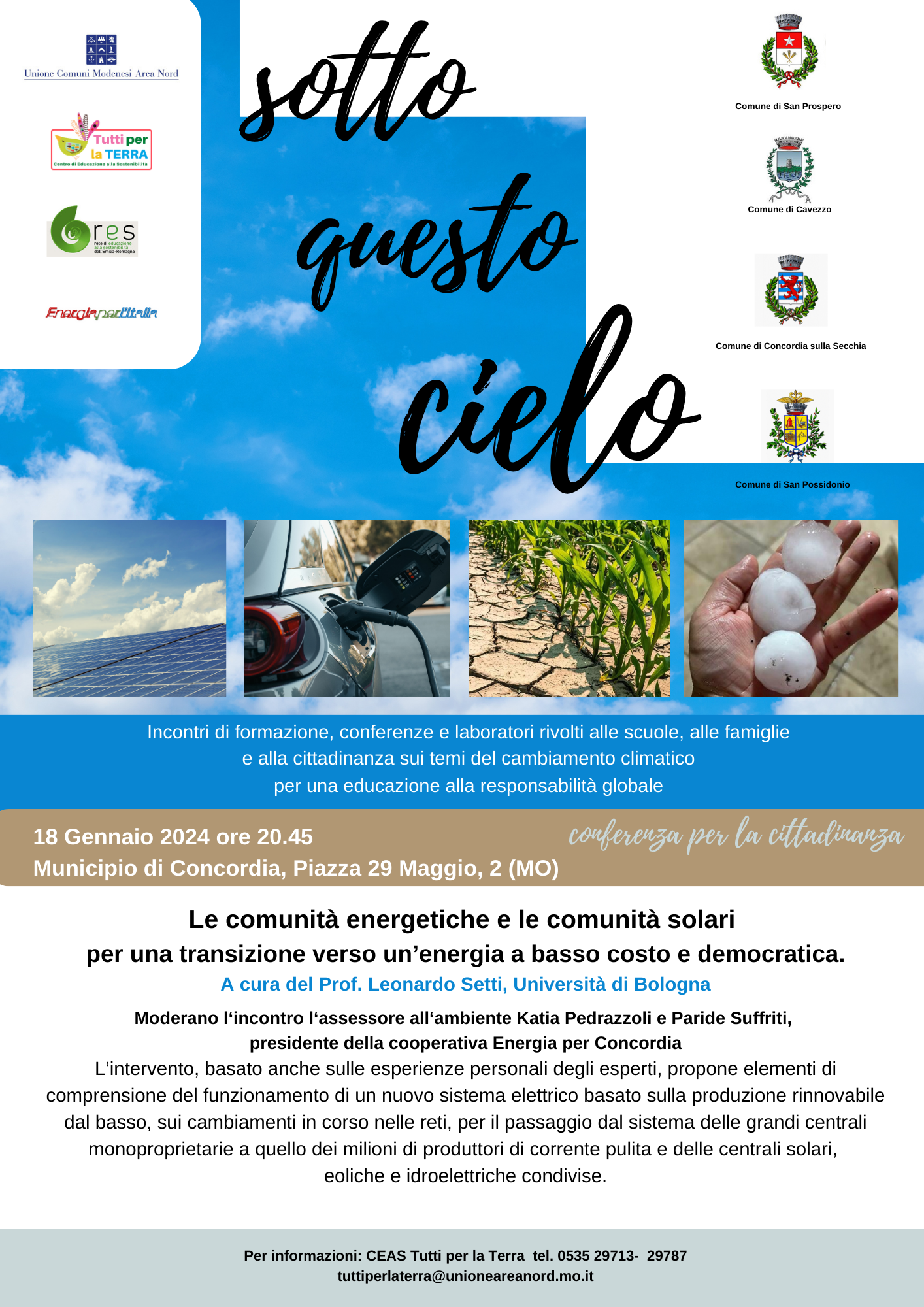 Giovedì 18 Gennaio ore 20.45 presso il Municipio di Concordia sulla Secchia, si parlerà di: Comunità energetiche e comunità solari, per una transizione verso un’energia a basso costo e democratica.