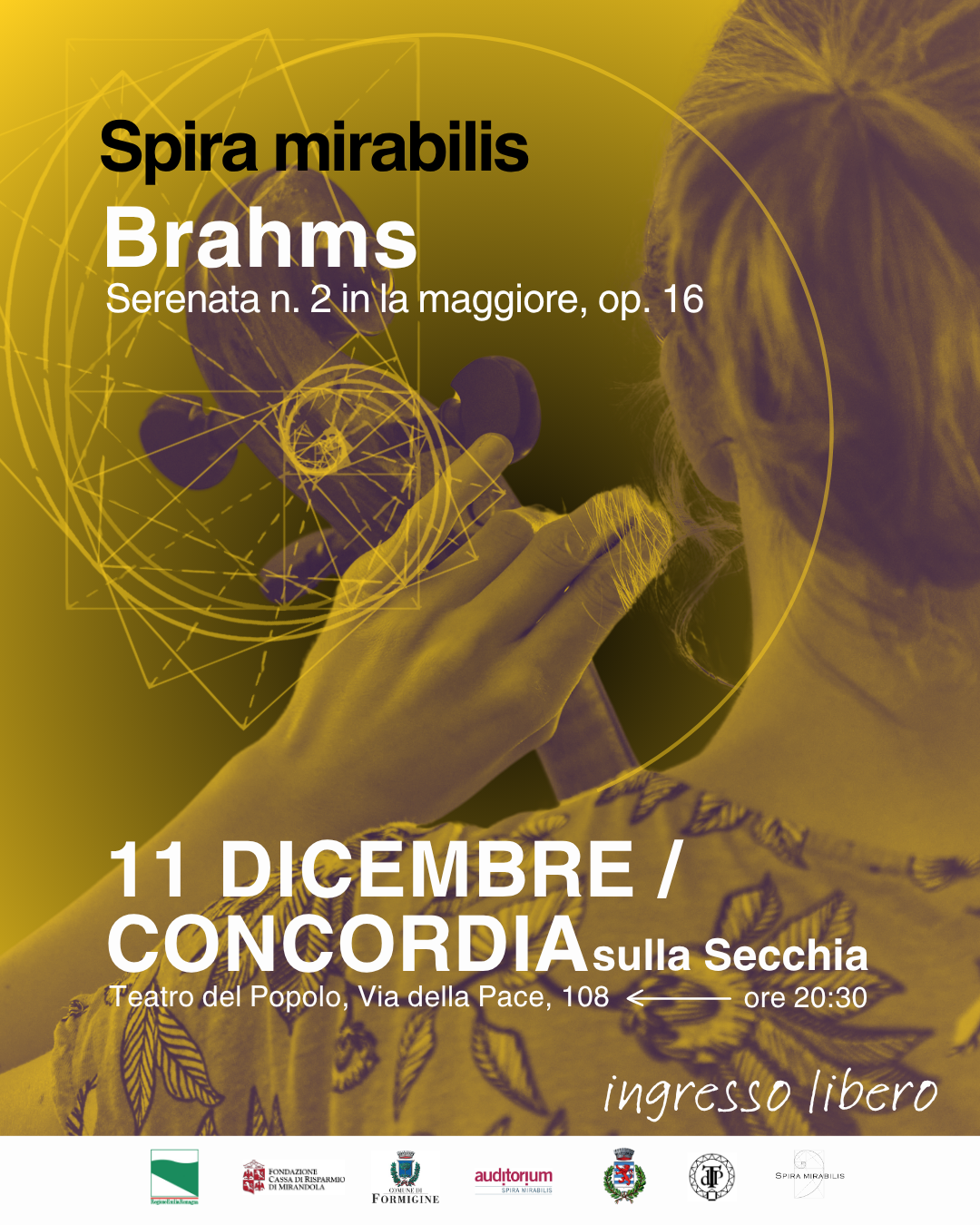 A dicembre, Spira Mirabilis torna a suonare nel modenese, in particolare qui a Concordia, martedì 11 dicembre, presso il Teatro del Popolo, con un nuovo progetto dedicato a Johannes Brahms, geniale compositore tedesco che si avvicinò in gioventù alla scrittura orchestrale con cautela, scegliendo la forma flessibile e varia della Serenata come primo terreno di esplorazione. Solo più tardi, e non senza timori, avrebbe affrontato la sua prima sinfonia.