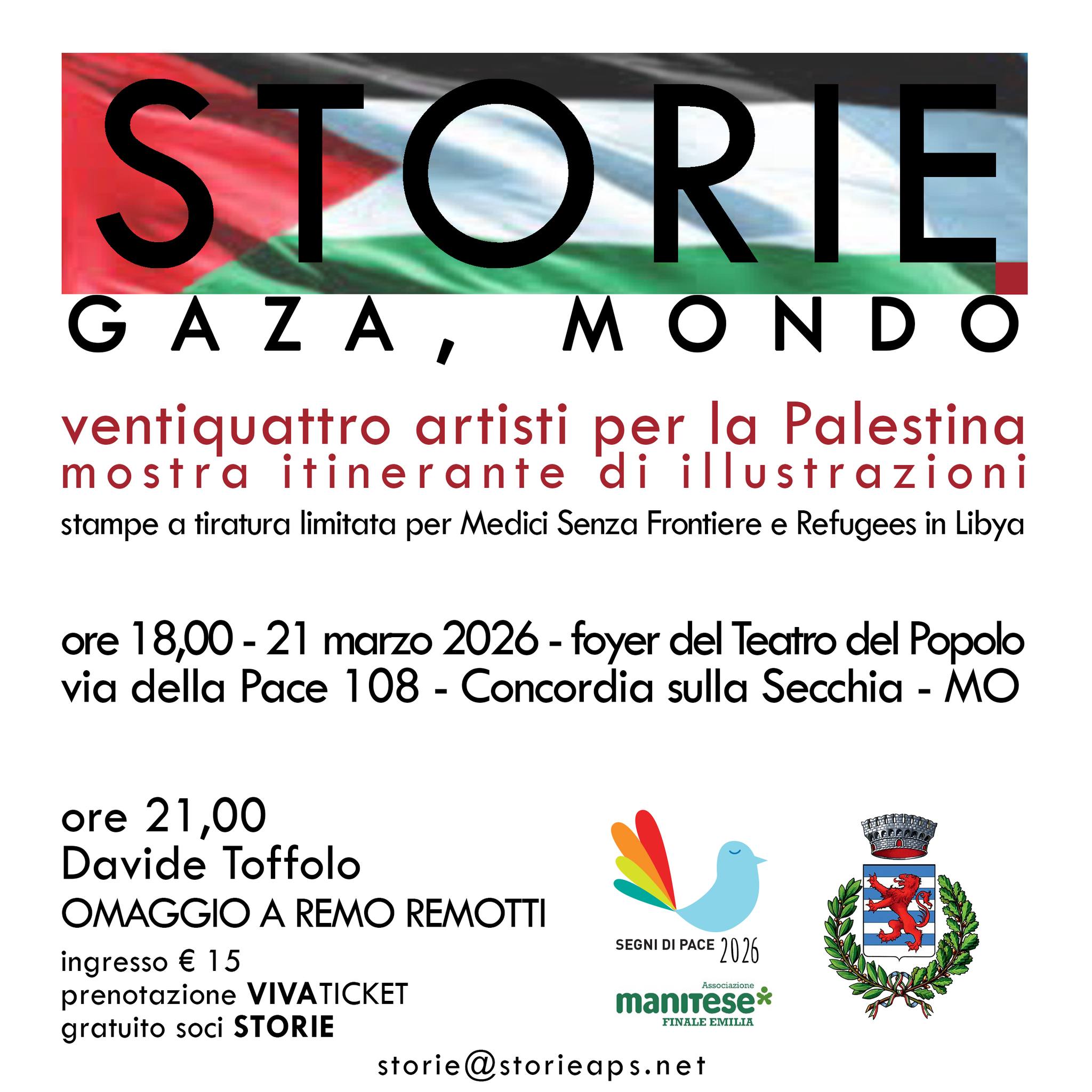 Sabato 21 marzo, in occasione dello spettacolo Omaggio a Remo Remotti di Davide Toffolo, il Teatro del Popolo ospiterà a partire dalle ore 17.30 la mostra itinerante di illustrazioni “Gaza, Storie, Mondo”, promossa dall'associazione STORIE aps. L’esposizione raccoglie le opere di 24 illustratori di fama nazionale e internazionale che hanno messo a disposizione i propri lavori per questo progetto di solidarietà.
