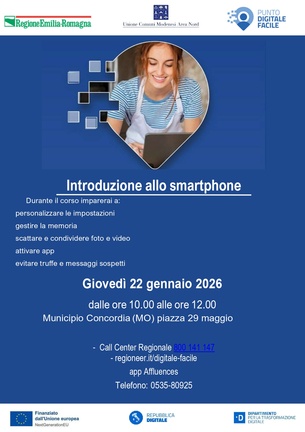 Giovedì 22 gennaio, dalle ore 10:00 alle ore 12:00 presso la Sala consiliare del Comune di Concordia, in piazza 29 Maggio n. 2, il Punto Digitale Facile organizza un incontro formativo gratuito sull'uso dello smartphone, per approfondire la conoscenza del suo utilizzo.